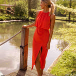 Laat je zomerse elegantee spreken com de Lisa™ midijurk com hoge halslijn e sierlijke zijsplit !