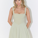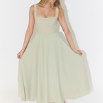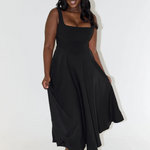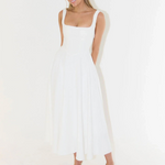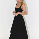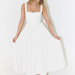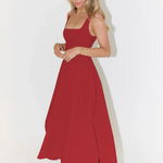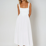 La coupe cintrée met en valeur votre silhouette de manière naturelle, tandis que la jupe midi apporte une touche à la fois élégante et ludique. Les bretelles larges et le décolleté carré offrent un look moderne et classique qui rappelle l'esthétique chic française.